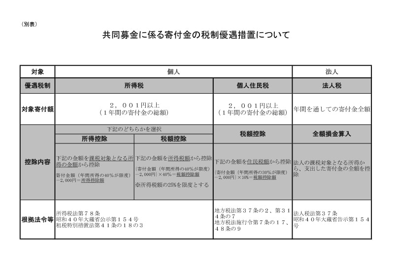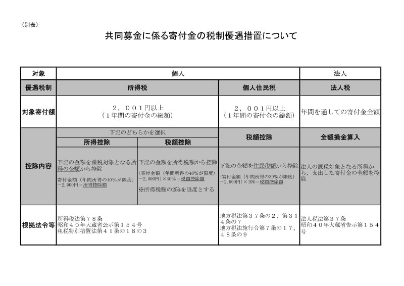 募金へのご協力をして下さった方に対し、税制上の優遇措置があります。個人の場合は年間を通じた寄付金の総額が2,001円以上の場合に控除対象となり、法人の場合は寄付金の全額が損金扱いとなります。詳しくは下記の表をご覧ください。